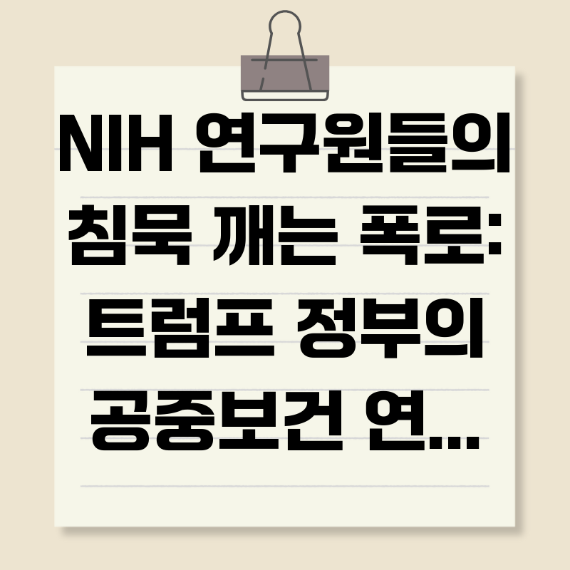 최근 미국 국립보건원(NIH) 연구원들이 트럼프 정부의 공공 보건 연구 예산 삭감에 대해 공개적으로 비판하고 나서면서 큰 파장이 일고 있습니다. 이들의 폭로는 단순한 예산 문제에 그치지 않고, 미국의 과학 연구 시스템 전반에 대한 심각한 우려를 제기하고 있습니다. 과연 트럼프 정부의 예산 삭감은 어떤 내용을 담고 있으며, NIH 연구원들은 왜 침묵을 깨고 나섰을까요? 그리고 이러한 상황이 미국의 공공 보건과 과학 기술 경쟁력에 미치는 영향은 무엇일까요? 본 글에서는 NIH 연구원들의 폭로 내용을 심층적으로 분석하고, 이 사태가 갖는 의미와 앞으로의 전망에 대해 자세히 살펴보겠습니다.