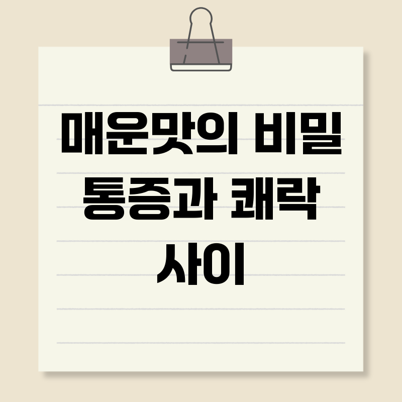 매운맛의 쾌감: 통증 속 숨겨진 중독의 과학매운 떡볶이, 불닭볶음면, 마라탕... 대한민국은 '맵부심'이라는 말이 있을 정도로 매운맛에 열광하는 사회입니다. 단순한 유행을 넘어, 하나의 문화 현상으로 자리 잡았죠. 그런데, 우리는 왜 그토록 고통스러우면서도 멈출 수 없는 매운맛에 끌리는 걸까요? 오늘은 매운맛의 역설적인 매력, 즉 통증과 쾌감 사이를 오가는 아찔한 경험의 비밀을 파헤쳐 보고, 그 이면에 숨겨진 과학적 원리와 심리적 요인을 심층적으로 분석해 보겠습니다.매운맛, 미각이 아닌 통각?흔히 매운맛을 '맛'이라고 생각하지만, 엄밀히 말하면 미각이 아닌 통각에 가깝습니다. 혀에는 단맛, 짠맛, 신맛, 쓴맛, 감칠맛의 다섯 가지 기본 미각을 감지하는 수용체가 존재하지만, 매운맛을 감지하는 수용체는 따로..